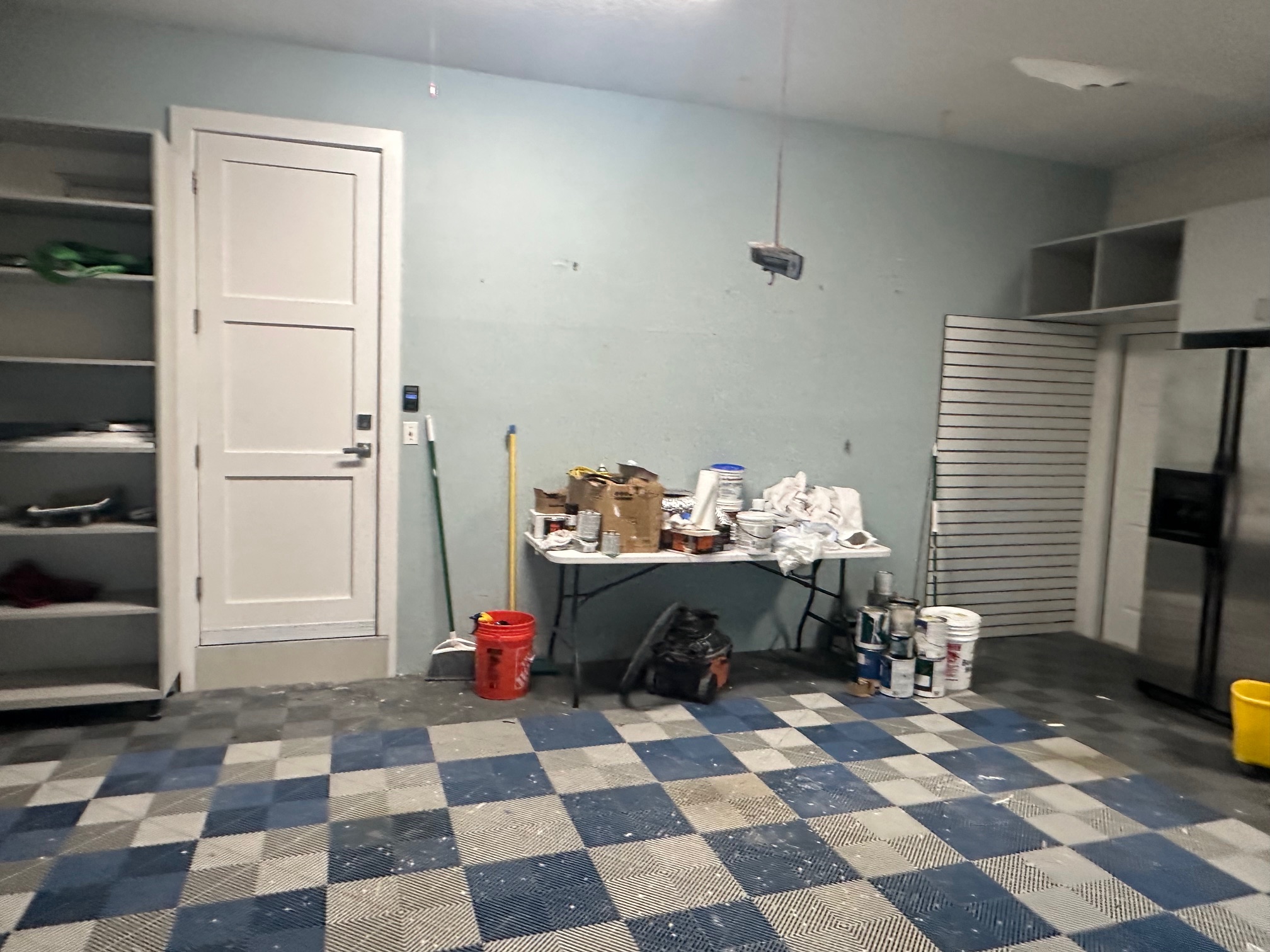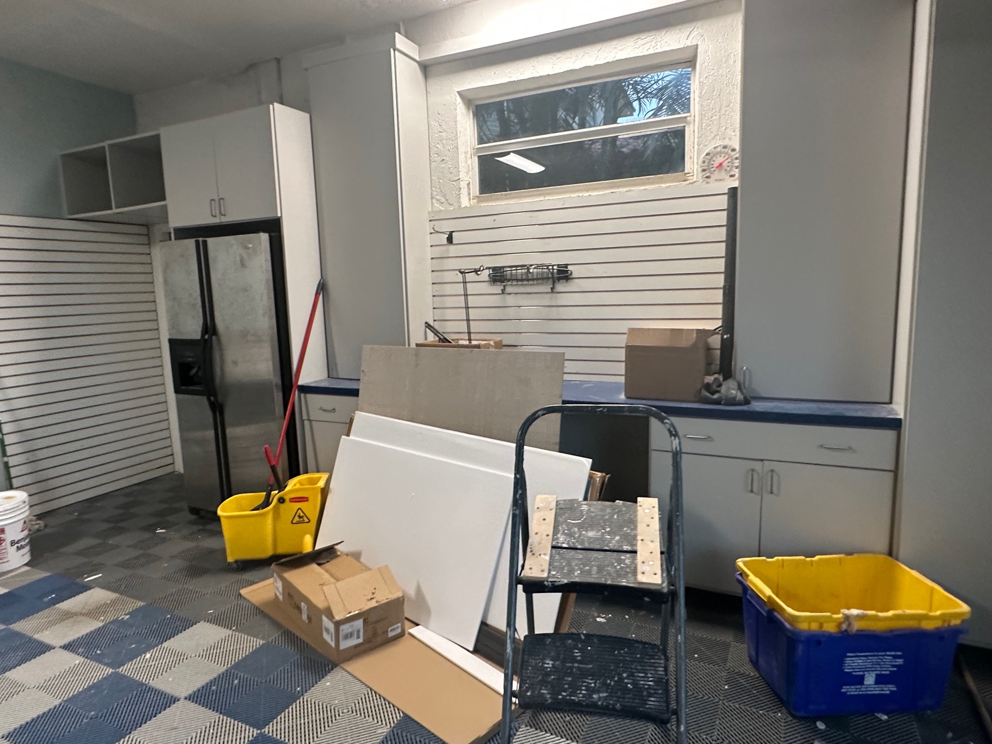As part of the demolition process, we removed both the existing cabinets and the interlocking tiles to properly prepare the concrete surface.