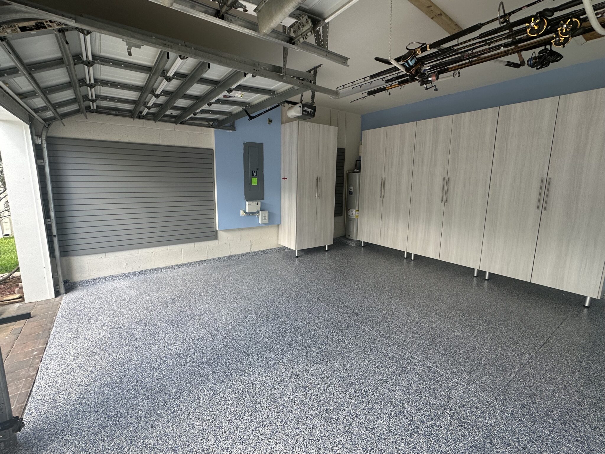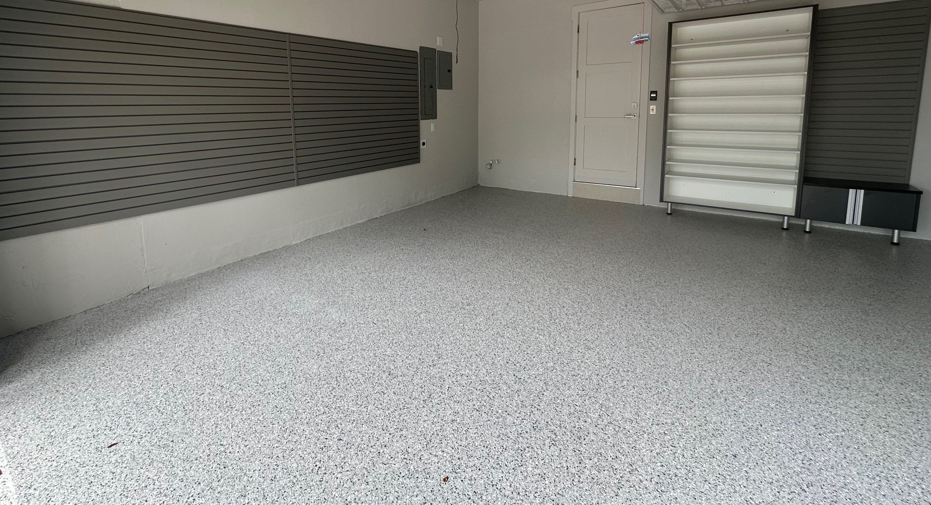 With the concrete properly prepared, we installed an epoxy polyaspartic floor using our Lunar flake finish.