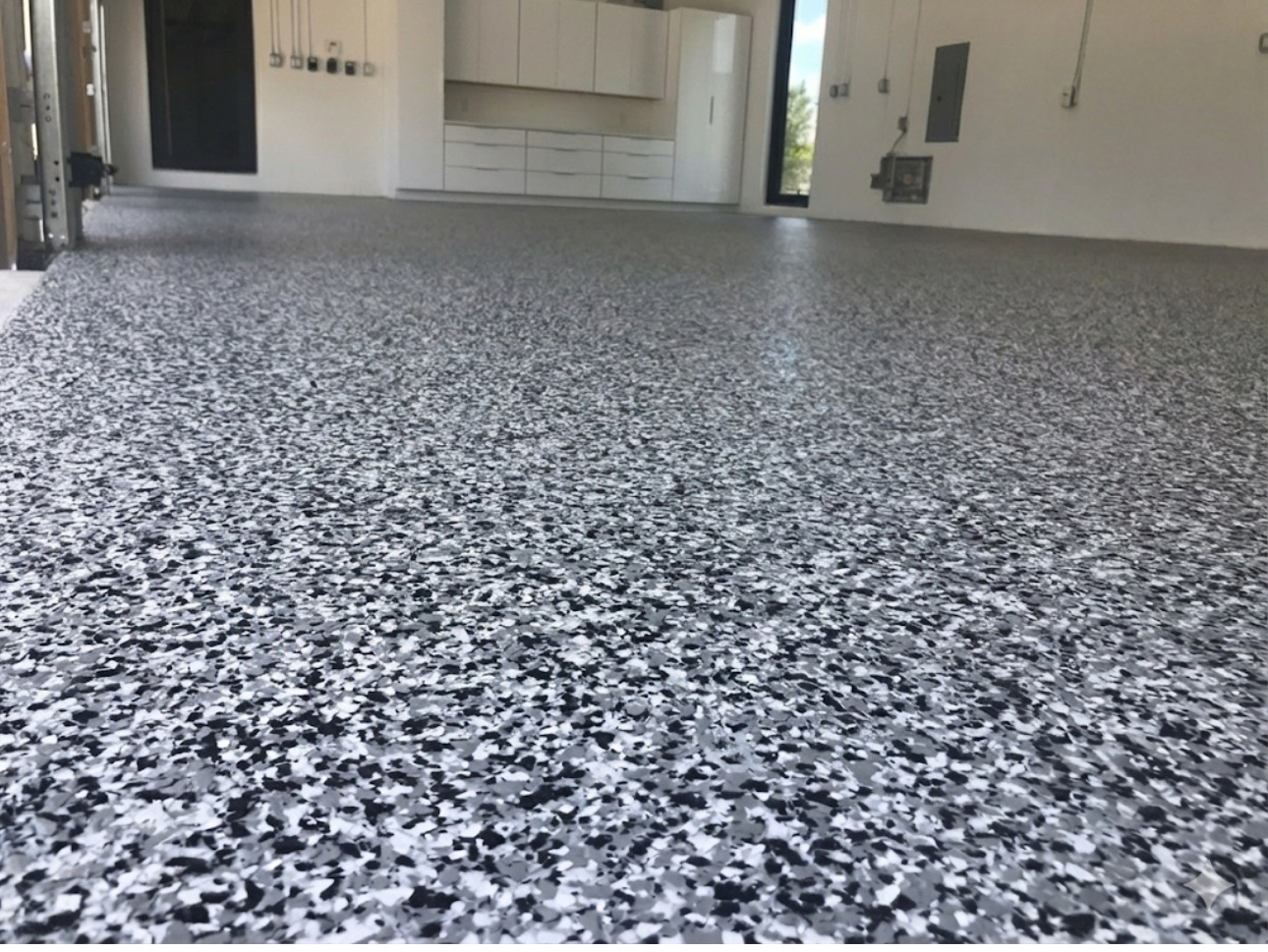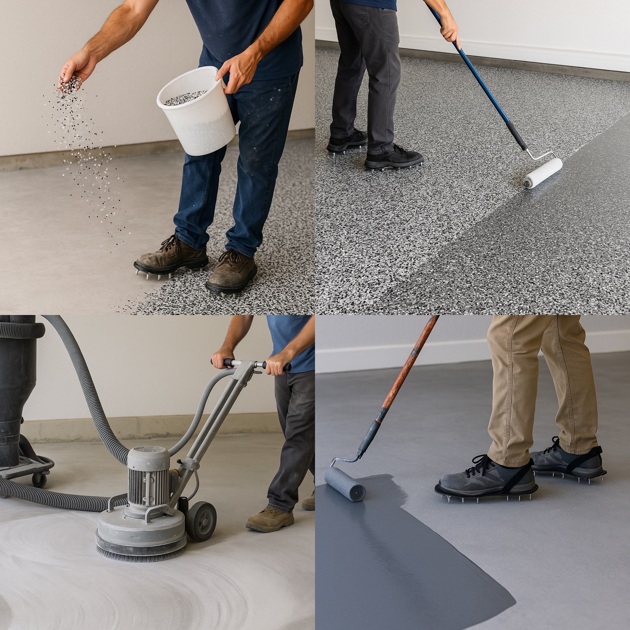 We spread decorative color flakes completely across the floor and remove excess flakes during the process. These flakes not only enhance the look but also create a slip-resistant surface for improved safety and functionality.