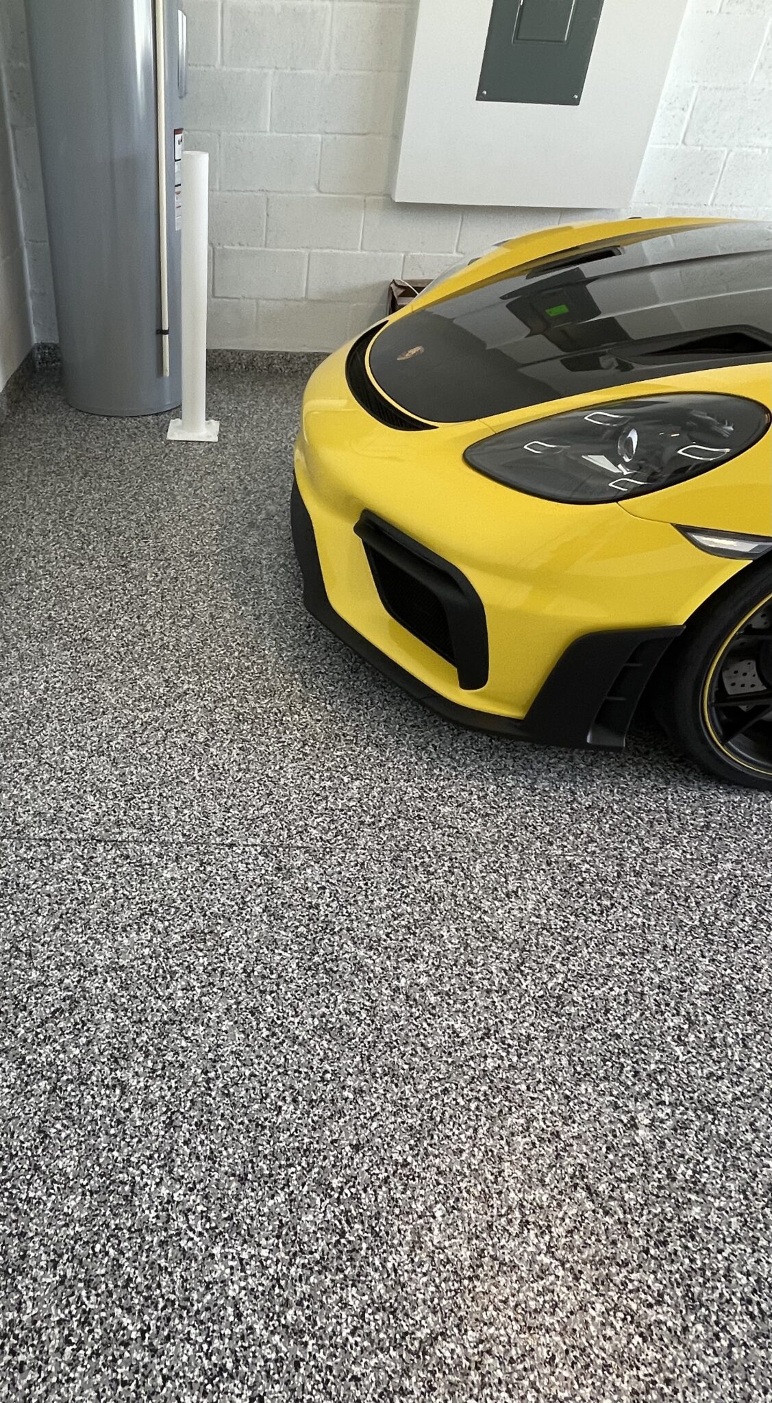 The final polyaspartic topcoat seals the flakes and the garage floor, offering exceptional durability, UV stability, and resistance to chemicals, stains, and abrasions. The floor is ready to use the next morning.